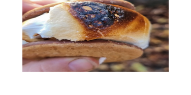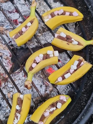 Toasted banana over the embers of a fire are just delicious! We melt chocolate and mini marsmallows inside the skin and then you just scoop the middle out! Dairy free and vegan options available. Half a banana per child.