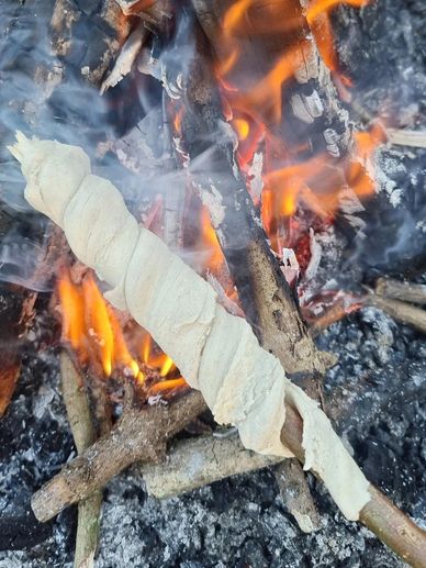 This is a simple bread recipe which we wrap around a stick and cook on the fire. This can be plain, salty, cinnamon flavoured, cheese, chocolate or even nettle damper bread!